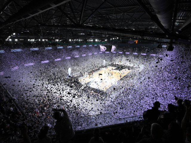 În tribunele BT Arena s-a desfăşurat un adevărat spectacol, cu coregrafii speciale susţinute de fanii îmbrăcaţi în alb-negru, culorile celor două cluburi. Mii de confetti au acoperit parchetul BT Arena, iar susţinătorii campioanei României au cântat imnul ”Slavă ţie, studenţie!” cu fularele ridicate.